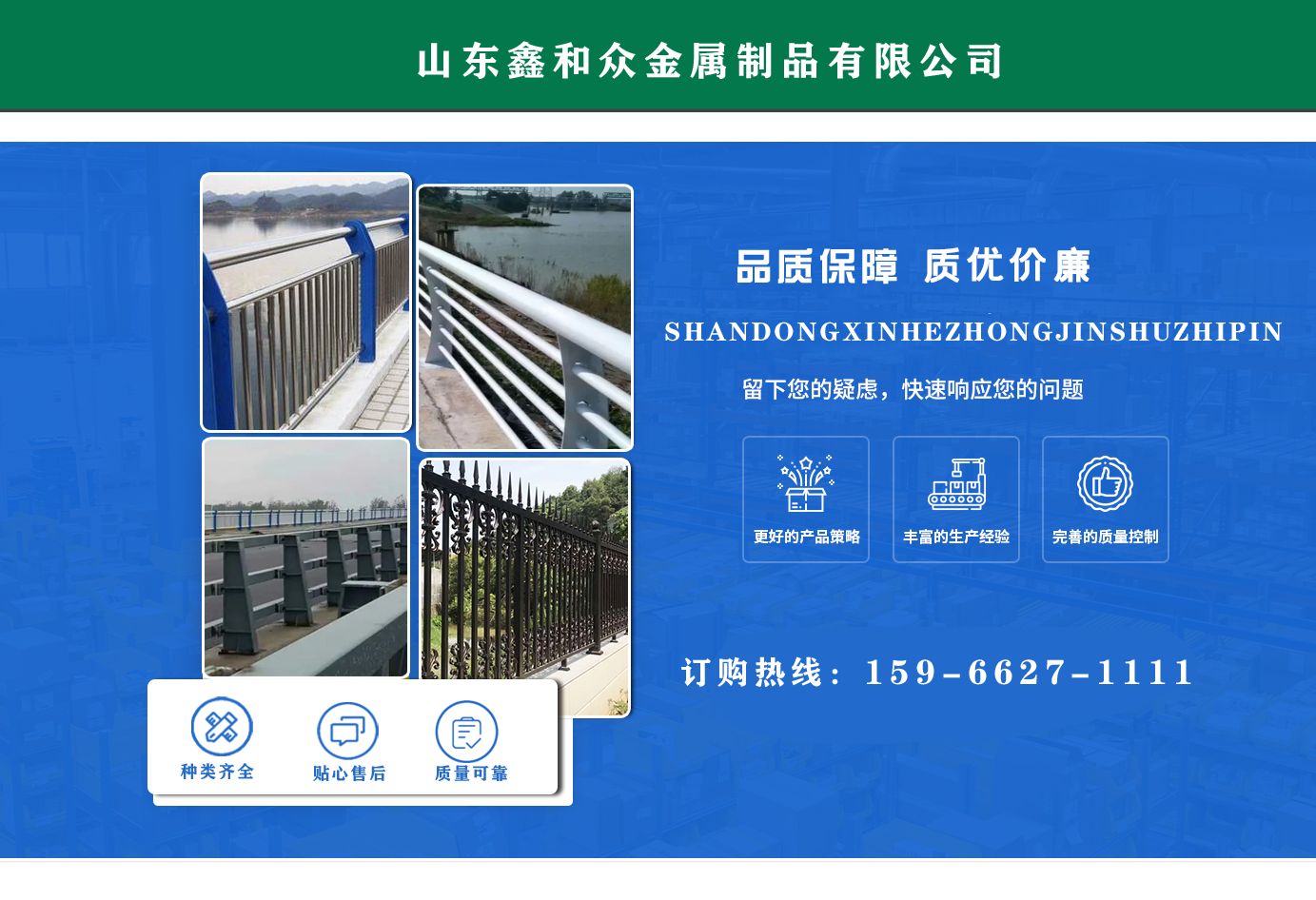 山東鑫和眾金屬制品有限公司主要產(chǎn)品有防撞護欄,橋梁護欄,道路護欄,河道護欄,不銹鋼護欄等護欄。提供設計方案,一站式定制,包您滿意價格優(yōu)惠,歡迎來電咨詢! 公司常年從事銷售護欄防撞護欄,橋梁護欄,道路護欄,河道護欄,不銹鋼護欄,橋梁鋼護欄,河道燈光護欄等。產(chǎn)品廣泛應用于橋梁、河道、旅游景區(qū)、道路、公路、公園、小區(qū)、景觀、道路防撞等領域。 公司產(chǎn)品均采用優(yōu)質(zhì)不銹鋼材料,符合相關標準。各種型號不銹鋼復合管及護欄,質(zhì)量嚴格把控。產(chǎn)品強度高、耐腐蝕、焊接牢固、抗沖擊、性能好,防撞護欄結(jié)構簡單、美觀實用大方。 歡迎前來訂購!...